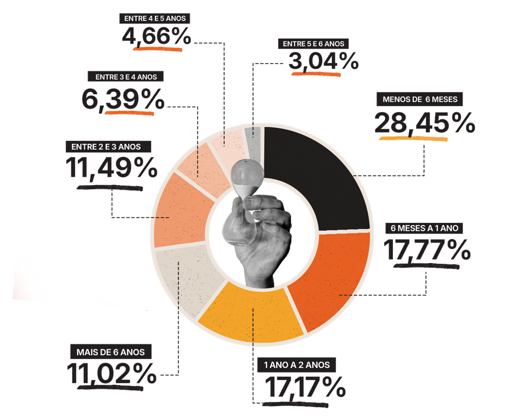 Pela pesquisa, 28,45% estudam há menos de seis meses e 17,77 de seis meses a um ano. Outros 17,17% estudam de um a dois anos.