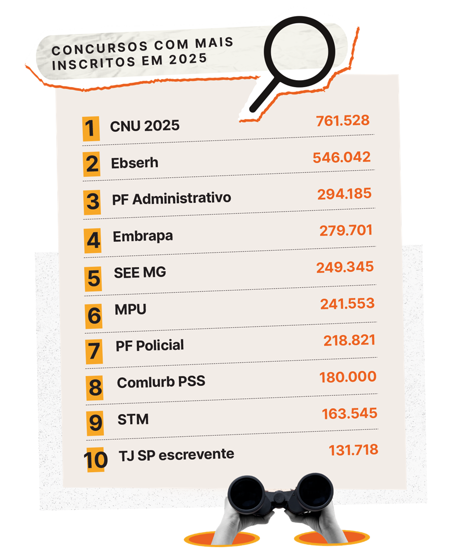 A alta no número de concursos em 2025 atraiu milhares de interessados em ingressar no serviço público. Confira a lista com os dez concursos com mais inscritos no ano: