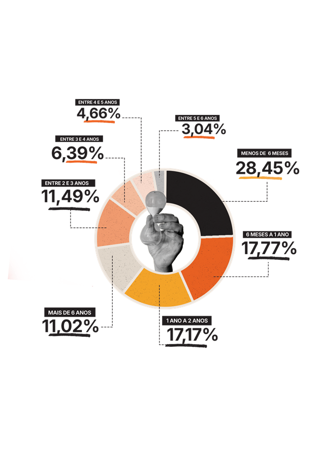 A maior parte dos concurseiros estuda há menos de seis meses, seguida pelos que se preparam entre seis meses a um ano e de um a dois anos. Veja no gráfico abaixo: