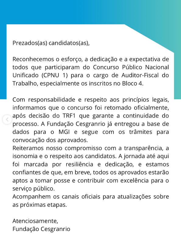 “O concurso foi retomado oficialmente, após decisão do TRF1 que garante a continuidade do processo. A Fundação Cesgranrio já entregou a base de dados para o MGI e segue com os trâmites para convocação dos aprovados”, diz o comunicado.