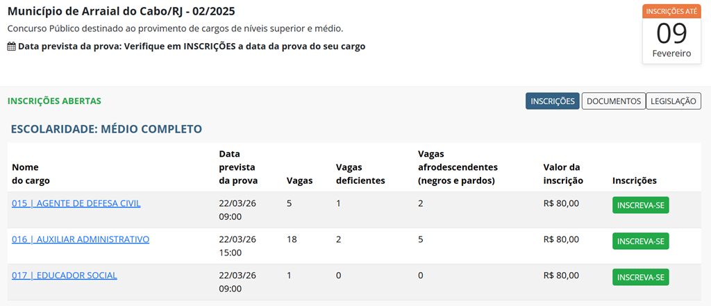 O edital do concurso para a Prefeitura de Arraial do Cabo, no Rio de Janeiro, foi publicado no final de dezembro de 2025. A oferta é de 73 vagas imediatas para cargos dos níveis médio e superior. Veja a lista completa a seguir: