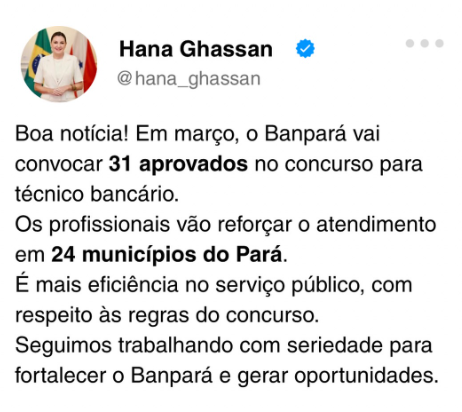A seguir, veja a publicação da vice-governador sobre as novas chamadas do Banpará: