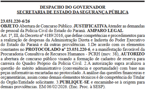 A autorização do novo concurso PC PR 2026 foi publicada oficialmente na última segunda-feira, dia 9. A seleção já havia sido confirmada pelo governador Ratinho Junior na última semana.
