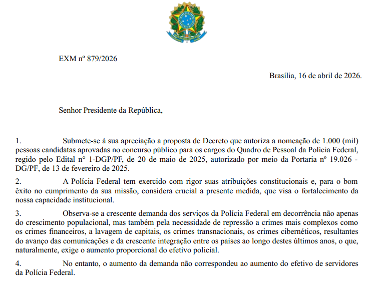 De acordo com a exposição de motivos enviada ao presidente, a medida busca reforçar o efetivo da corporação diante do cenário crítico de pessoal e da crescente demanda por atuação policial no país