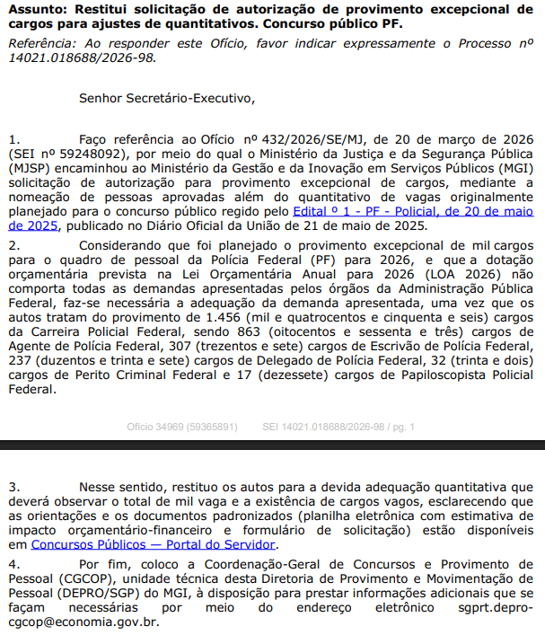 O Ministério da Gestão e da Inovação (MGI) negou o pedido da Polícia Federal para a convocação de 1.456 candidatos excedentes do concurso PF.