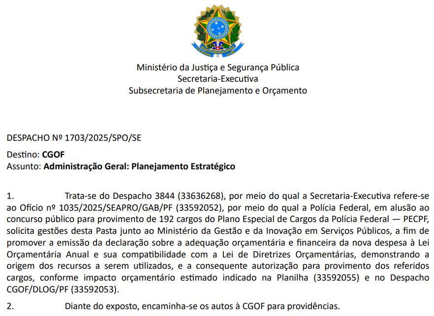 No ofício, assinado pela Coordenadoria-Geral de Orçamento, Finanças e Contabilidade, a PF solicita que o MGI emita uma declaração de adequação orçamentária e financeira, atestando que as despesas com as nomeações estão compatíveis com a Lei Orçamentária Anual (LOA) e a Lei de Diretrizes Orçamentárias (LDO).