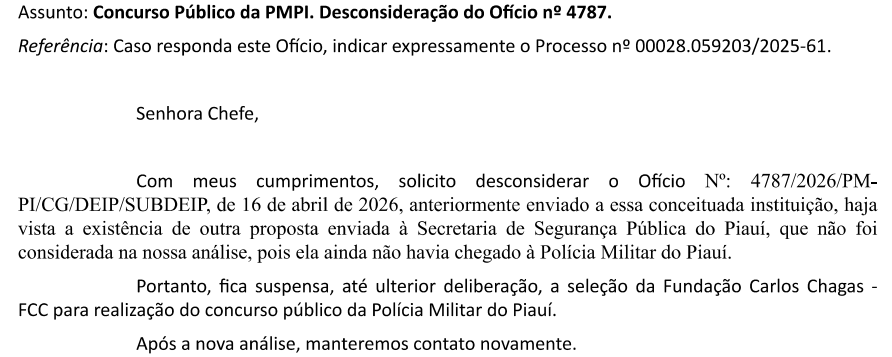 O ofício, assinado pelo presidente da comissão do concurso, tenente-coronel José Soares de Alencar Filho, apenas solicita a desconsideração do documento anterior que indicava a FCC como organizadora.