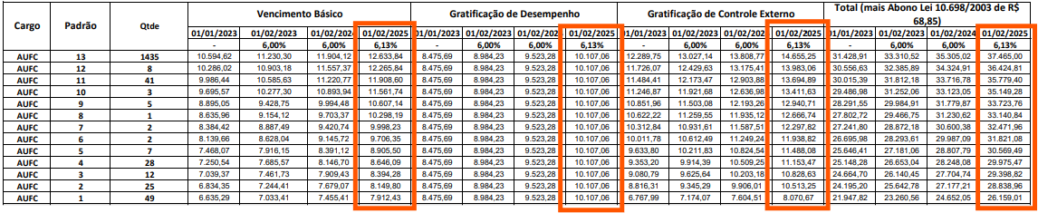 Veja os detalhes dos ganhos do TCU em cada nível da carreira: