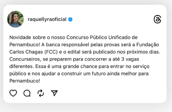 Foi definida a banca que cuidará do 1º Concurso Unificado Pernambuco. De acordo com informações da governadora do estado, Raquel Lyra, a seleção ficará sob responsabilidade da Fundação Carlos Chagas (FCC).
