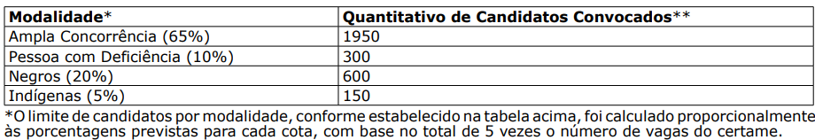 As oportunidades estão distribuídas entre a ampla concorrência e as cotas, sendo: