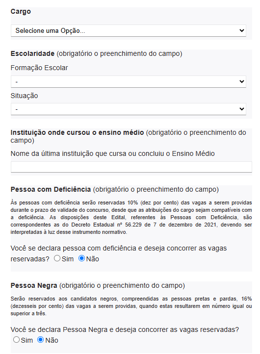 Após o envio da foto, o candidato deverá informar o cargo para o qual deseja concorrer e demais informações importantes, como se está enquadrado na categoria de pessoa com deficiência, pessoa negra, integrante de povos indígenas, pessoa trans ou se necessita de atendimento especial na aplicação das provas objetiva e discursiva.
