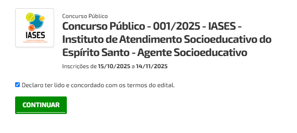 Para iniciar a inscrição no concurso Iases, o candidato deverá acessar a página do cargo no qual deseja (agente socioeducativo ou técnico superior socioeducativo) e clicar no botão verde de "INSCRIÇÃO ONLINE".