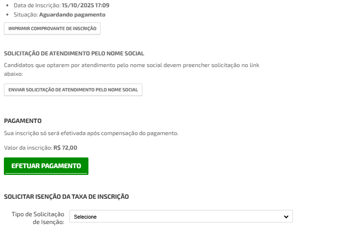 Nessa página, o candidato poderá imprimir o comprovante de inscrição, enviar a solicitação de atendimento pelo nome social, efetuar o pagamento da taxa e, caso deseje, solicitar a isenção do valor da inscrição.