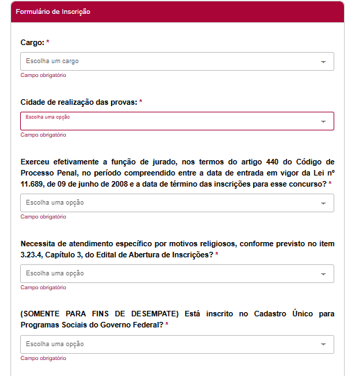Nessa etapa, será necessário informar o cargo desejado e a cidade de realização das provas.