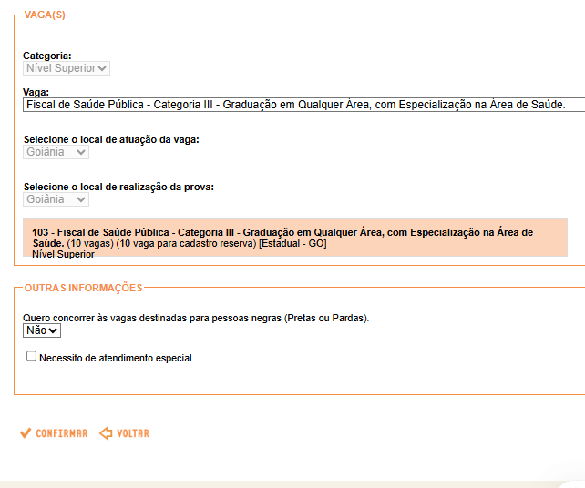 Por meio dela, será necessário indicar a vaga. Após isso, não será preciso informar o "local de atuação da vaga" nem o "local de realização da prova", visto que tais campos serão preenchidos automaticamente, após informar a vaga desejada.