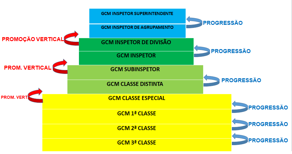 Enquanto a progressão ocorre dentro do quadro da mesma classe (ex.: da 3ª classe para a 2ª classe), na promoção vertical o guarda passa de uma categoria para outra (ex.: da classe especial para a classe distinta).